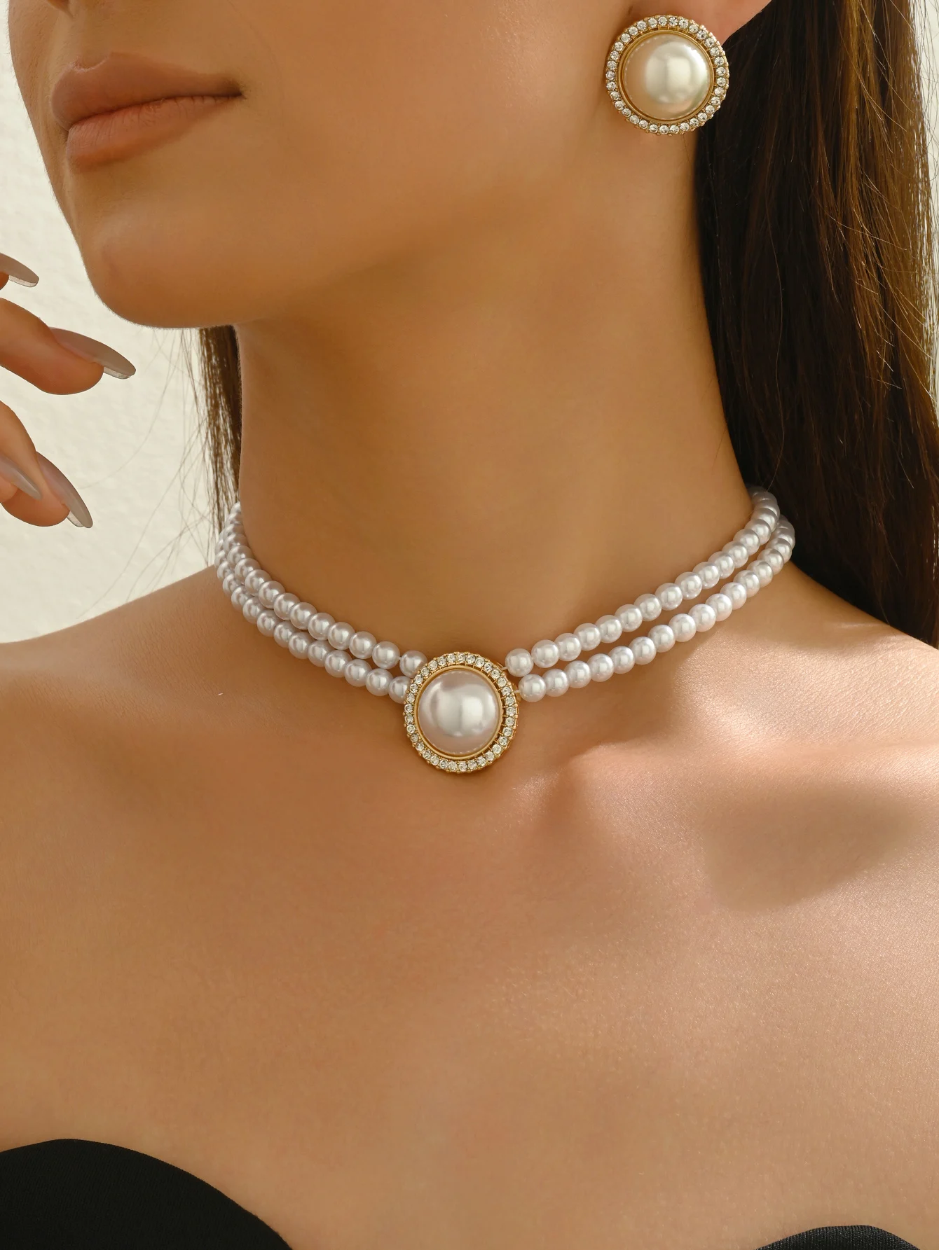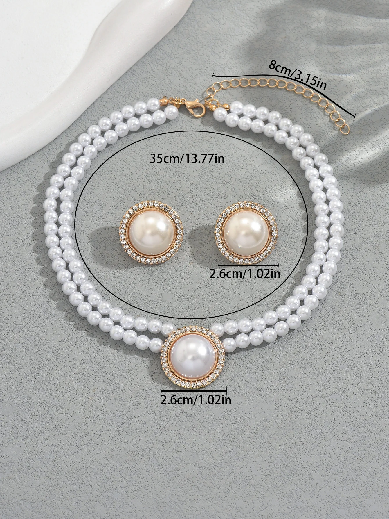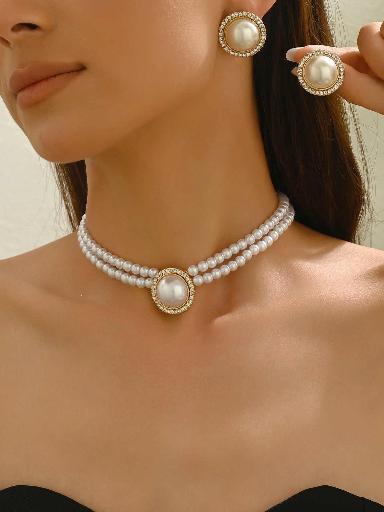 Name:Elegant Double Layered Imitation Pearl Choker Earrings Set With Shiny Rhinestone Women's Classic 2 PCS Wedding Jewelry Set