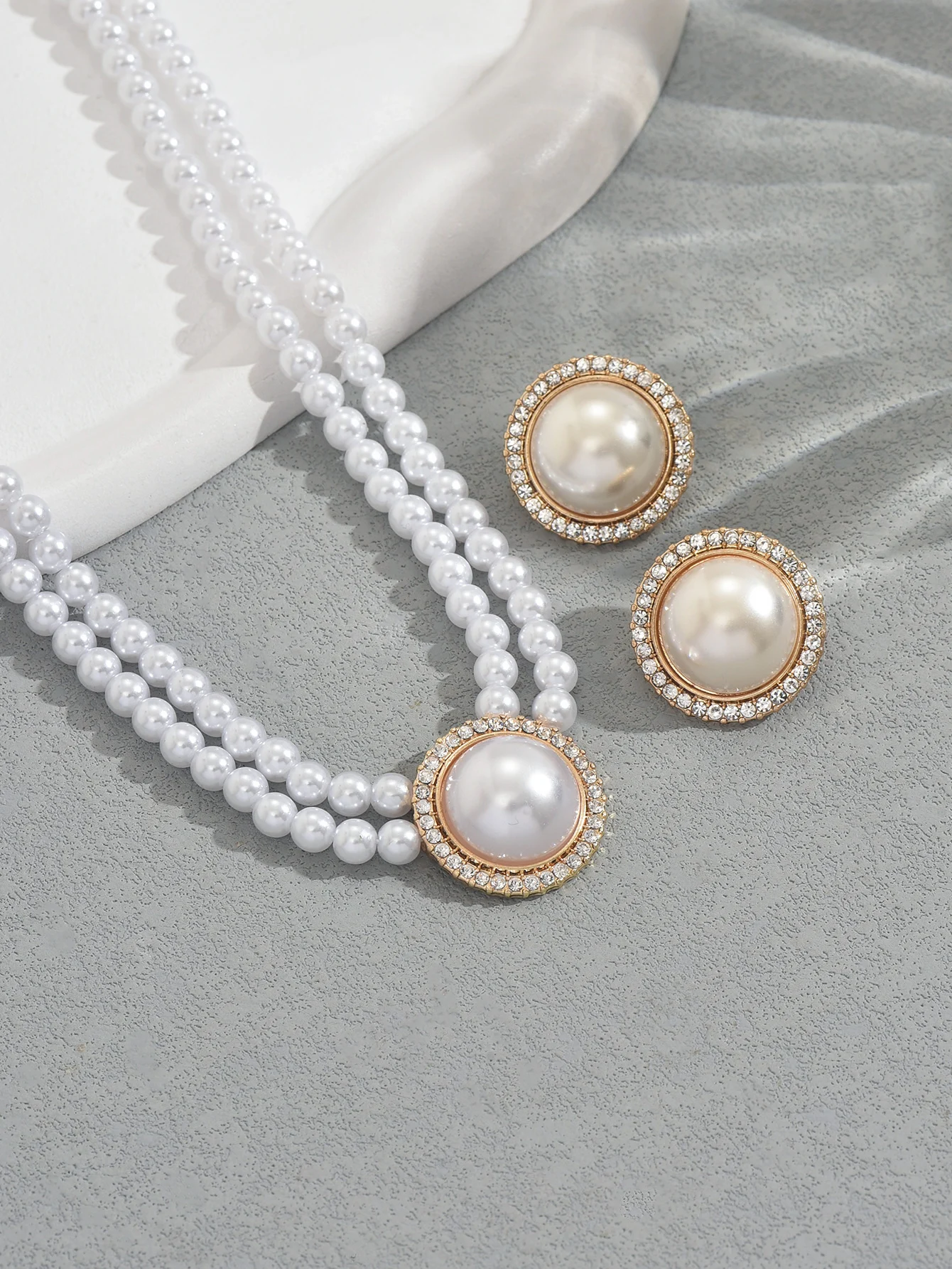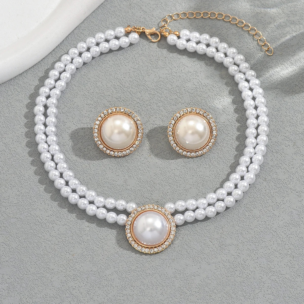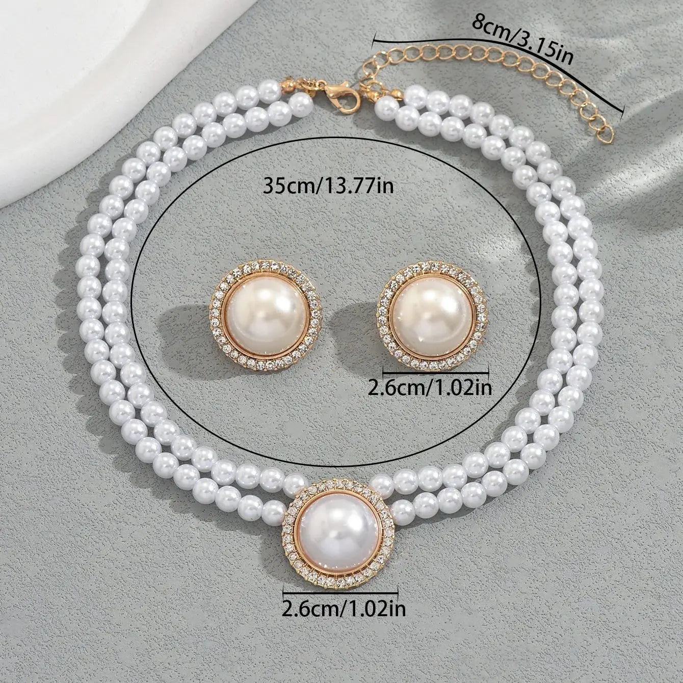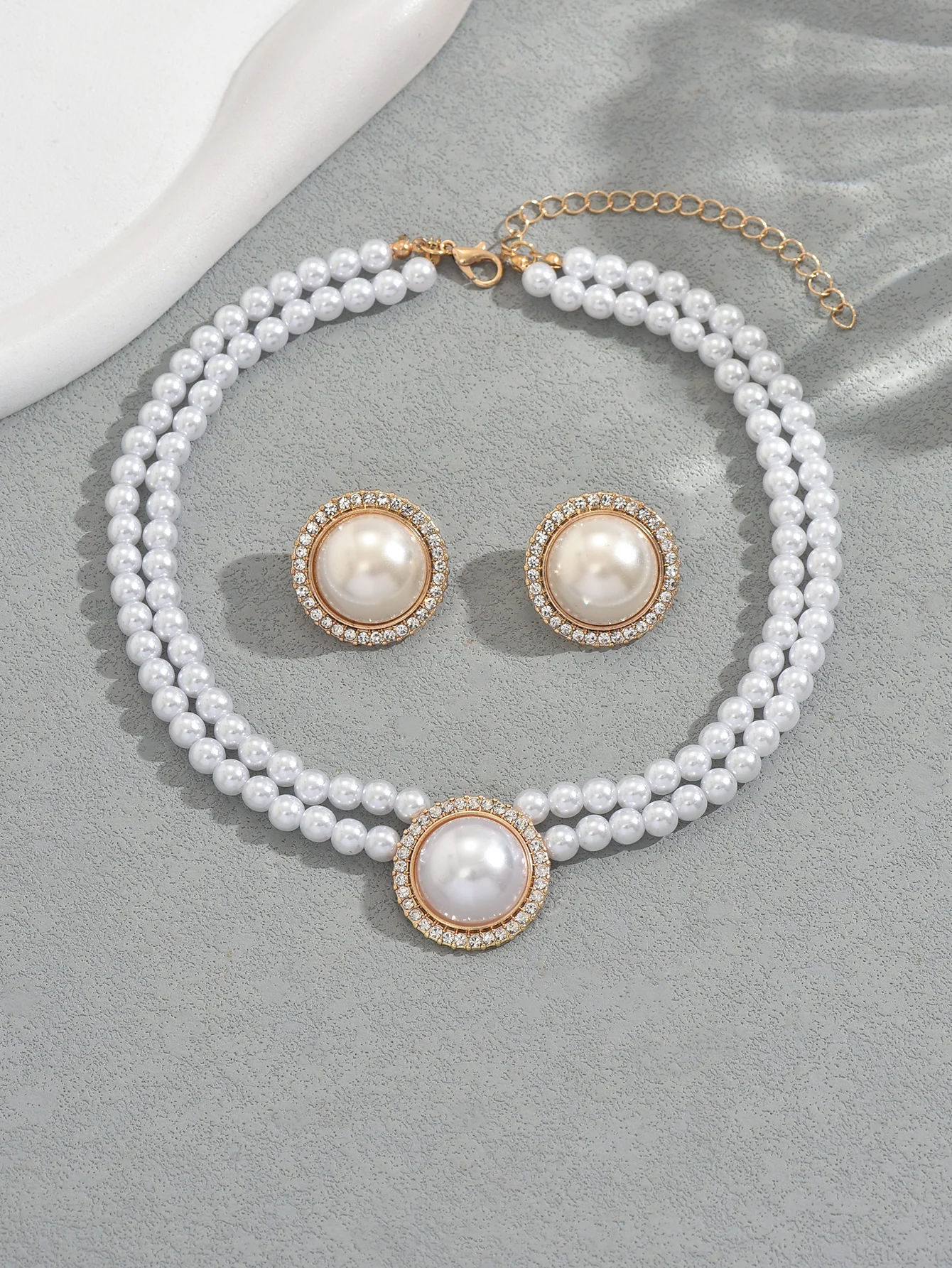 Name:Elegant Double Layered Imitation Pearl Choker Earrings Set With Shiny Rhinestone Women's Classic 2 PCS Wedding Jewelry Set